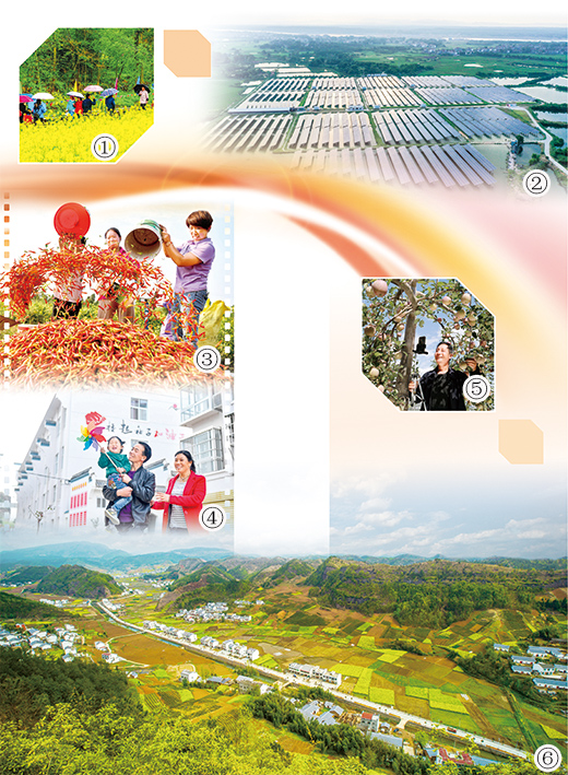 图①:四川省巴中市通江县泥溪镇梨园坝村,脱贫主导产业乡村游火爆。程聪摄 图②:江西省吉安市万安县窑头镇通津村,“渔光互补”光伏扶贫电站整齐连片。邱哲摄 图③:安徽省亳州市谯城区双沟镇三官村,丰收的辣椒映红了脱贫户的笑脸。刘勤利摄 图④:河南省洛阳市栾川县狮子庙镇金河湾易地扶贫搬迁社区,搬迁户满脸幸福。刘冰摄 图⑤:全国首个电商扶贫试点市甘肃省陇南市,礼县龙槐村果农在果园直播销售苹果。李旭春摄 图⑥:湖北省十堰市竹山县擂鼓镇枣园村,脱贫攻坚期间新修的农村公路穿村而过。章磊摄