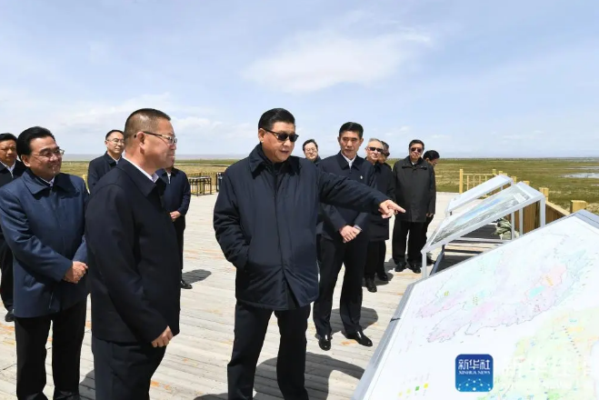6月7日至9日,习近平在青海考察。这是8日下午,习近平在海北藏族自治州刚察县青海湖仙女湾,了解青海省加强祁连山地区和青海湖生态环境保护等情况。新华社记者 谢环驰 摄