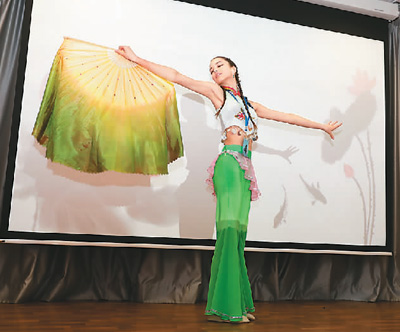 5月26日,第十四届“汉语桥”世界中学生中文比赛圣彼得堡赛区比赛举行。图为“汉语桥”比赛青年组选手爱丽丝表演舞蹈《采莲》。(新华社发)