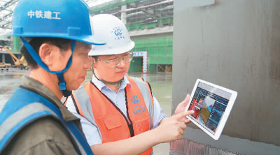 6月9日,北京丰台站项目建设现场,技术人员正指导焊接工人使用钢结构全生命周期管理平台。 中铁建工集团供图