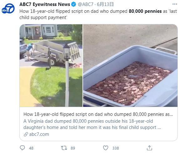 美国男子开拖车运8万枚硬币倒在前妻门口,支付