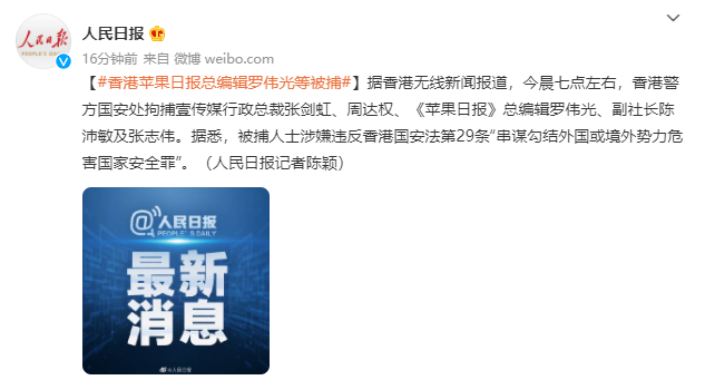 香港《苹果日报》总编辑罗伟光等被捕