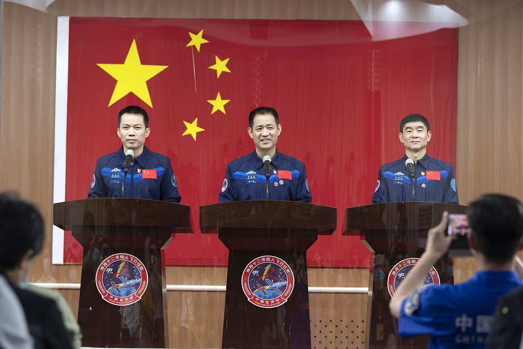 2021年6月16日,神舟十二号载人飞行任务航天员在甘肃酒泉卫星发射中心问天阁与中外媒体记者集体见面,并回答记者提问。(从左到右)航天员汤洪波、聂海胜和刘伯明出席。图源:视觉中国
