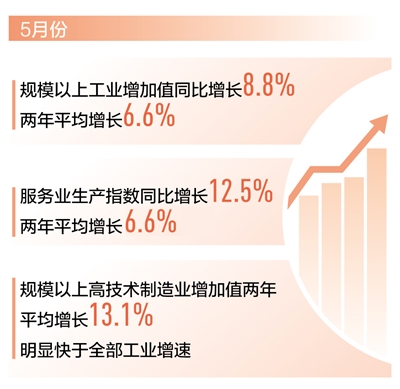 工业服务业稳定增长。5月份,全国规模以上工业增加值同比增长8.8%,两年平均增长6.6%;环比增长0.52%。全国服务业生产指数同比增长12.5%,两年平均增长6.6%,两年平均增速较4月份加快0.4个百分点。