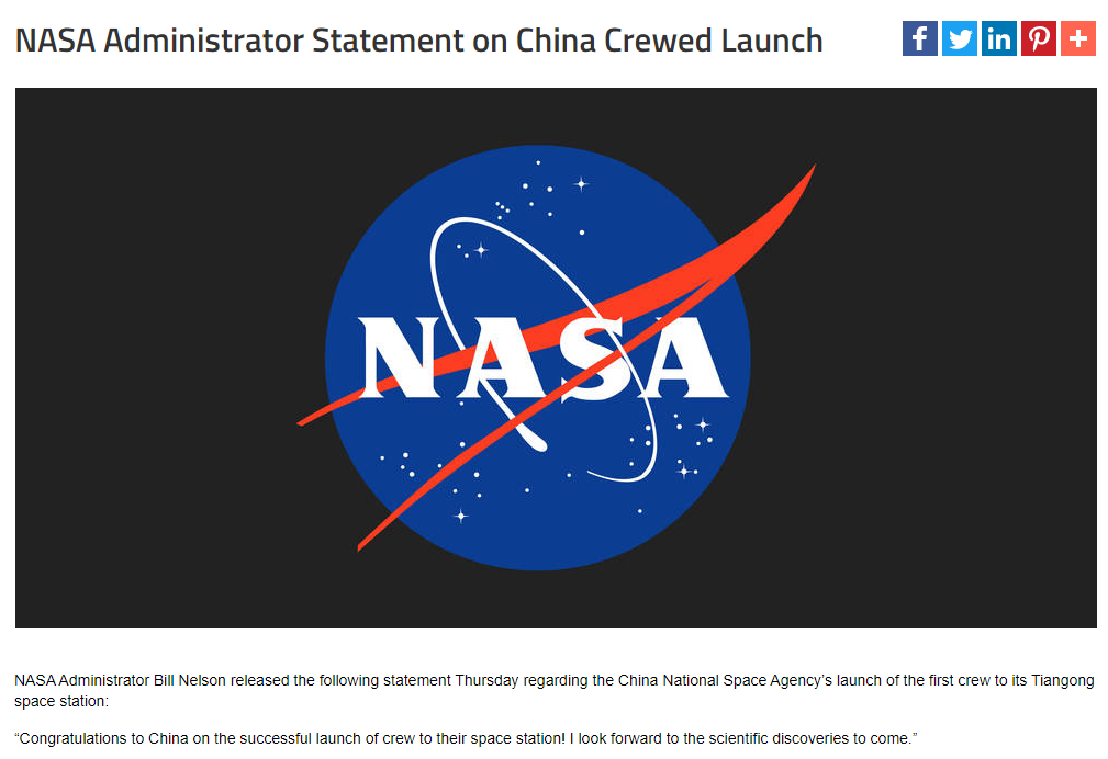 神舟十二号载人飞船发射圆满成功 NASA发文祝贺