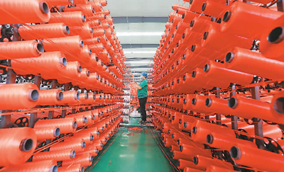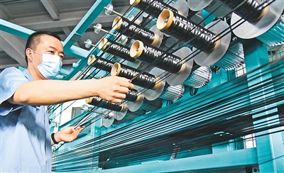 六月十六日,在江苏连云港经济技术开发区,工人在查看碳纤维生产线运行情况。 耿玉和摄(人民视觉)