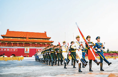 观看天安门广场升国旗仪式是众多游客来到北京必参加的活动之一。图为仪仗队员在升国旗仪式上正步行进。 刘帅治摄(人民图片)