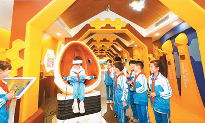 北京市密云区高岭学校的学生正在奥金达蜜蜂生态科普馆VR蛋椅上体验蜜蜂飞行。 贺 勇摄(人民视觉)