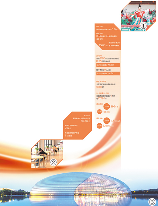 100年,翻天覆地,中国文化的实力令人刮目相看:今天的中国是世界第一出版大国,每年出版图书超过50万种,发行100亿多册;今天的中国是世界第二电影大国,每年拍摄各类电影近千部,票房600多亿元;今天的中国拥有5800多家博物馆、近3200家公共图书馆和22.5万家书店,每年参观博物馆的人次超过10亿、借阅图书近7亿册;今天的中国人每年观看各类演出超过11亿人次;今天的中国99%的人口可以收看收听电视广播,所有行政村都建有农家书屋、电子阅览室和文化活动室……