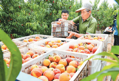 河北省邯郸市广平县融合“农业资源+乡村采摘游”,带动当地农民增收致富。图为6月16日,广平县胜营镇蔡庄村果农正把黄桃装车,准备外销。 程学虎摄(人民视觉)