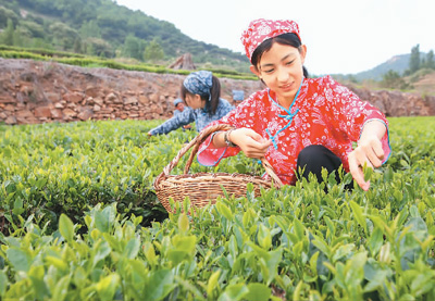 近年来,山东省日照市东港区后村镇积极发展绿茶产业,绿茶种植面积达4万余亩,实现产值10亿余元。图为6月12日,在后村镇独垛子村,村民正在采茶。 许传宝摄(人民视觉)