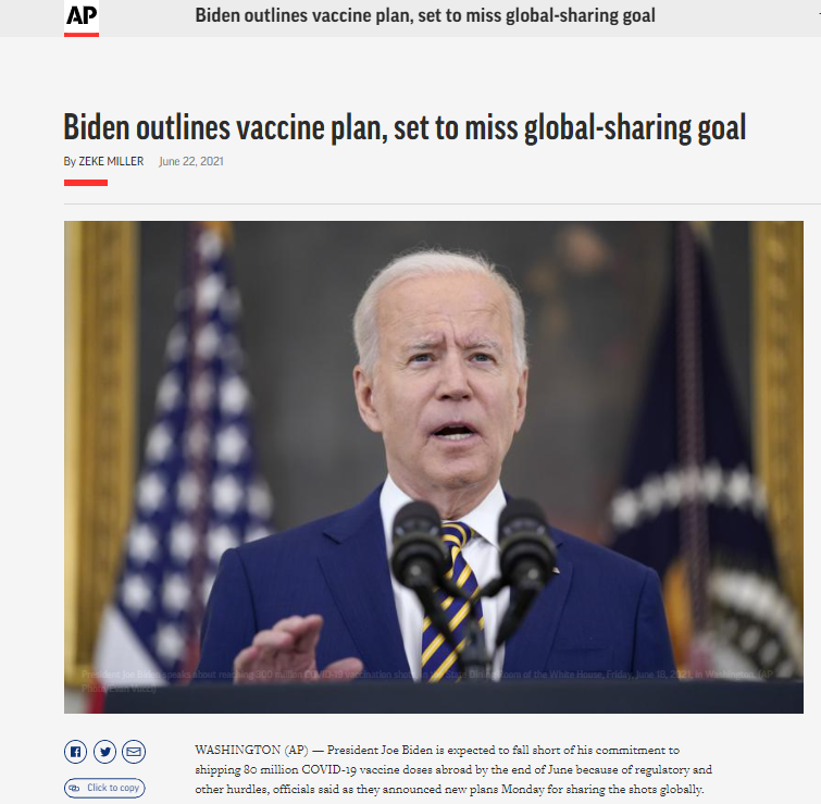 就在白宫应对新冠肺炎疫情小组当天正式宣布无法完成“独立日接种计划”前一天,姗姗来迟的美国新冠疫苗全球分享计划终于面世。据美国中文网报道,当地时间21日,白宫宣布了5500万剂新冠疫苗的全球分配计划。但白宫同时称,由于后勤等挑战,尚不能保证疫苗能够在月底前发货。