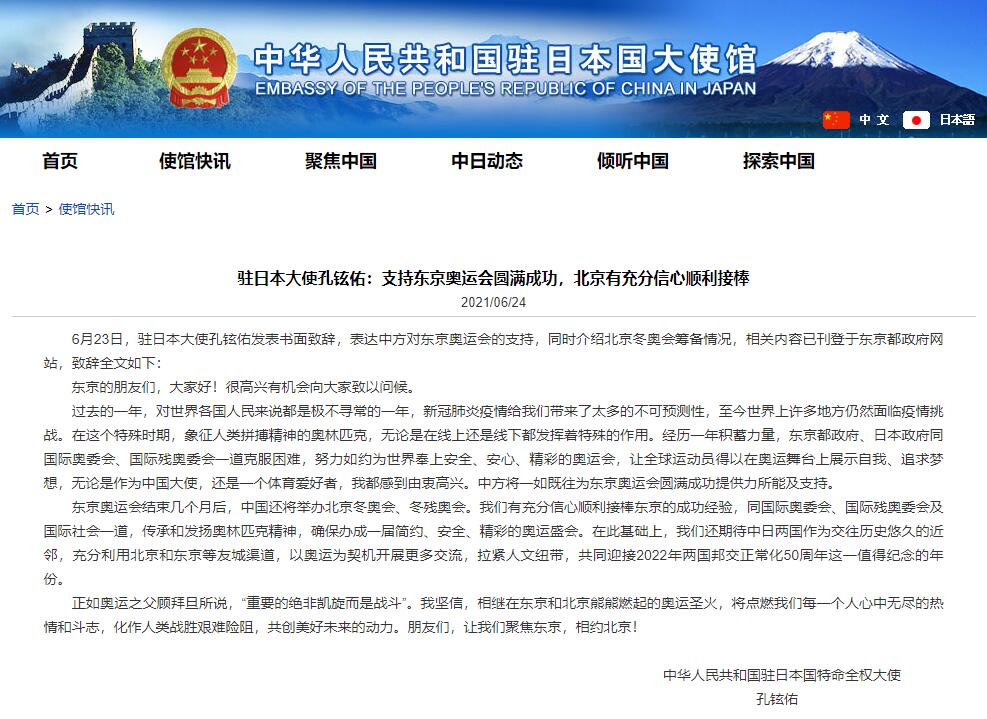 海外网6月24日电 据中国驻日本大使馆网站消息,6月23日,驻日本大使孔铉佑发表书面致辞,表达中方对东京奥运会的支持,同时介绍北京冬奥会筹备情况,相关内容已刊登于东京都政府网站,致辞全文如下:
