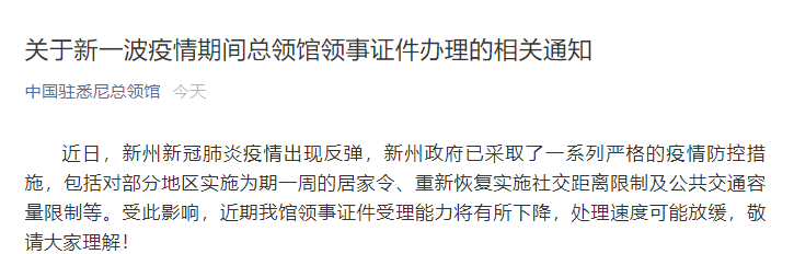 海外网6月25日电 据中国驻悉尼总领事馆微信公众号消息,近日,澳大利亚新南威尔士州新冠肺炎疫情出现反弹,新州政府已采取了一系列严格的疫情防控措施,包括对部分地区实施为期一周的居家令、重新恢复实施社交距离限制及公共交通容量限制等。受此影响,近期驻悉尼总领事馆领事证件受理能力将有所下降,处理速度可能放缓,敬请大家理解!