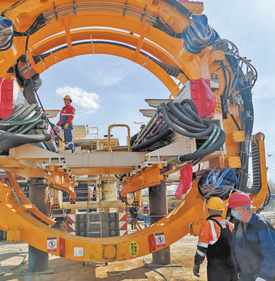 2020年4月9日,在俄罗斯首都莫斯科,工作人员正对用于莫斯科地铁建设工作的盾构机进行拼装作业,该盾构机由中国企业自主研发生产。