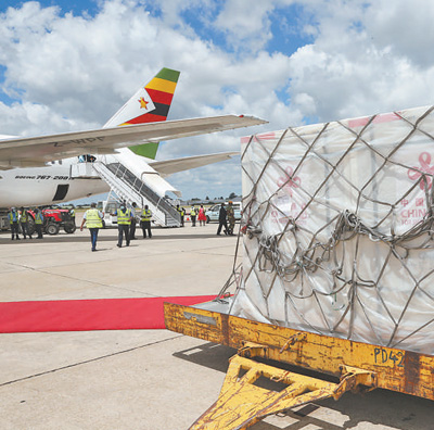 2021年3月16日,由中国政府援助的新冠疫苗运抵津巴布韦首都哈拉雷的罗伯特·穆加贝机场。 新华社记者 张玉亮摄