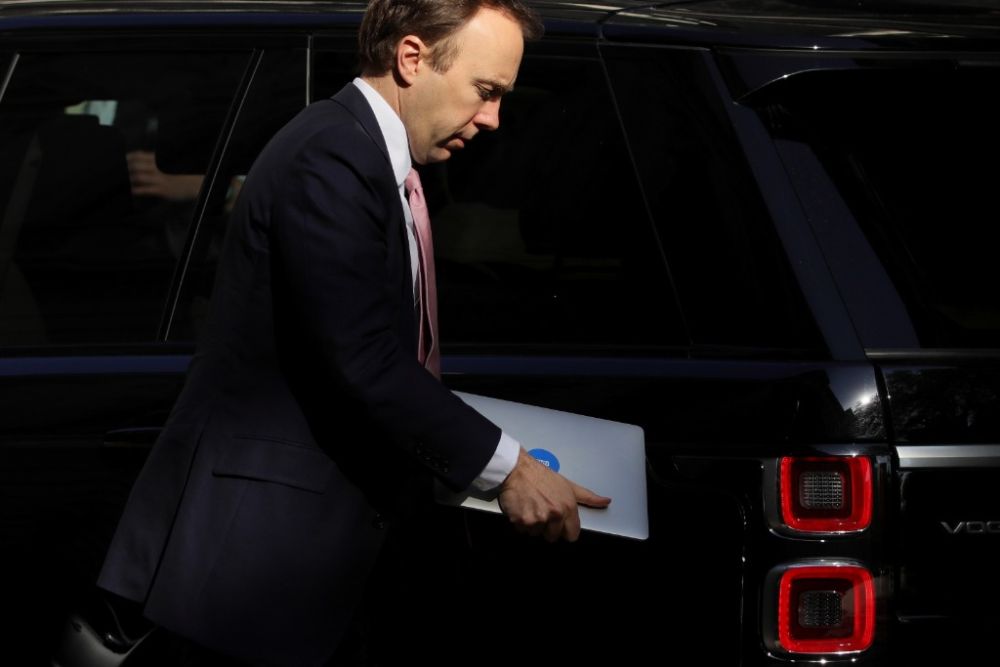 2020年4月8日,在英国伦敦,时任英国卫生大臣汉考克抵达唐宁街。(新华社发,蒂姆·爱尔兰摄)