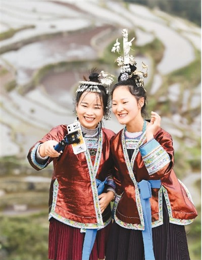 图为贵州省从江县加榜乡加车村村民直播推介加榜梯田风光。