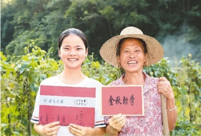 教育是民族振兴、社会进步的重要基石。当前,中国高等教育由大众化阶段向普及化阶段迈进。图为2020年9月8日,安徽安庆宿松县柳坪乡村民邓爱兰(右)和孙女吴婷华展示大学录取通知书和助学金。