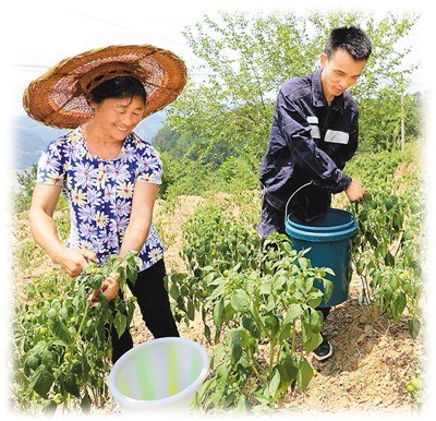陈福坤(右)在帮村民摘辣椒。安万强摄