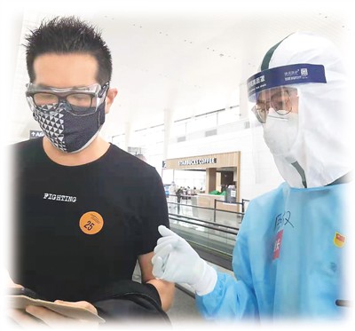 周炽权(右)在引导旅客进行健康申报。吕 尔摄