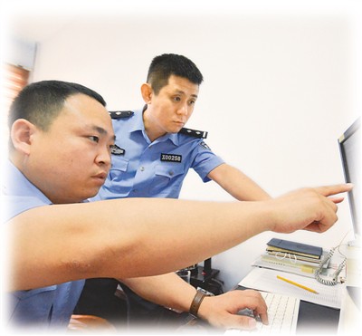 王帅(左)和同事在查看监控录像。李 昊摄