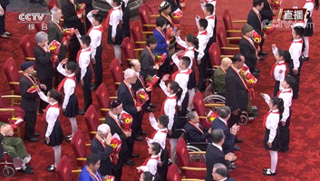 少先队员们向“七一勋章”获得者献花、敬礼。图源:央视新闻