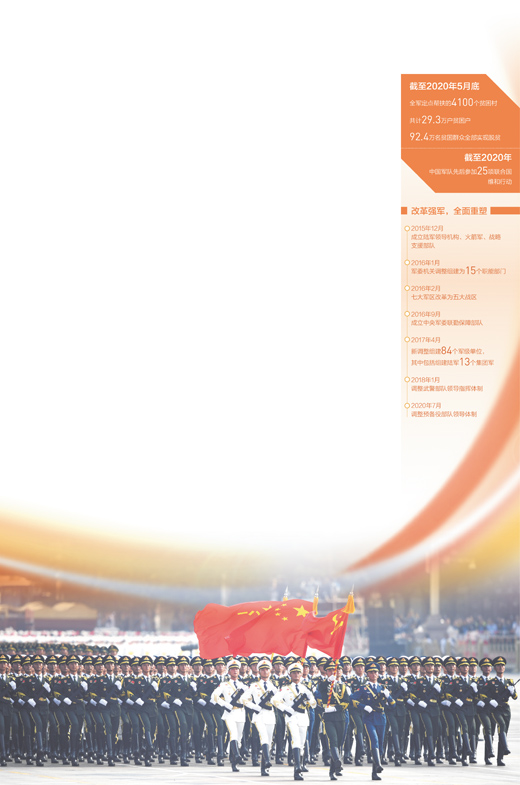 “是解放军,让我的人生从荒漠变成了绿洲。”曾就读于帕米尔高原上的迈丹小学、2018年考入吉林大学的古丽再娜·帕哈尔说。1962年解放军的一支连队刚来到迈丹村时,村里孩子上学非常困难。盖教室、捐文具、当老师……数十年来,连队官兵帮助村民的脚步从未停歇。截至2020年5月底,全军定点帮扶的4100个贫困村,共计29.3万户贫困户、92.4万名贫困群众全部实现脱贫。