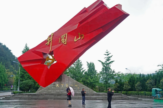 图片游客在井冈山“井冈红旗”雕塑前参观拍照。(图源:新华社)