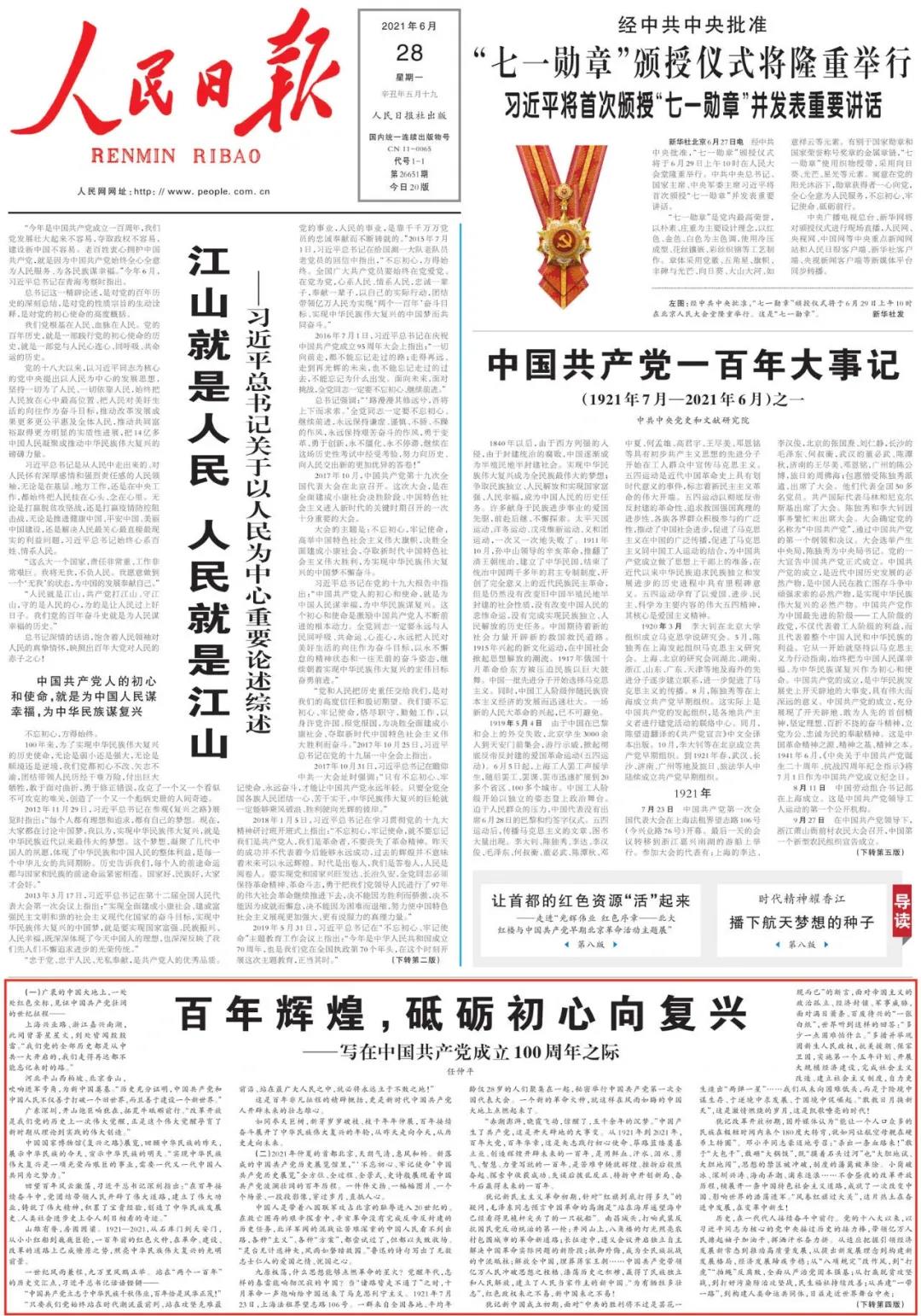 6月28日,人民日报头版发表任仲平文章《百年辉煌,砥砺初心向复兴——写在中国共产党成立100周年之际》。
