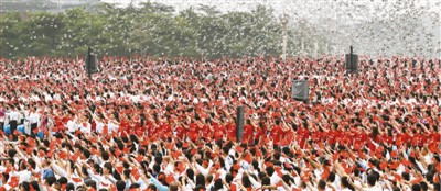 大会现场,和平鸽展翅高飞,现场观众一片欢腾。本报记者雷声摄