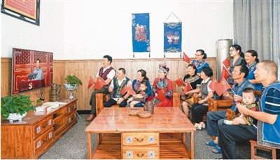7月1日,在浙江桐庐县莪山畲族乡龙峰民族村,村民围坐在电视机前,观看庆祝中国共产党成立100周年大会直播。何小华 王 甜摄