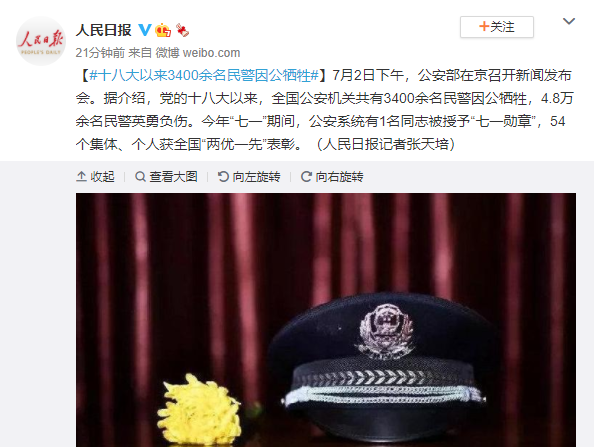 7月2日下午,公安部在京召开新闻发布会。据介绍,党的十八大以来,全国公安机关共有3400余名民警因公牺牲,4.8万余名民警英勇负伤。今年“七一”期间,公安系统有1名同志被授予“七一勋章”,54个集体、个人获全国“两优一先”表彰。(人民日报记者张天培)