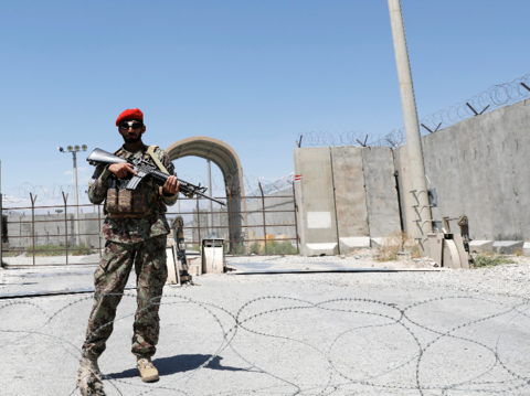 阿富汗士兵在巴格拉姆空军基地的大门守卫。