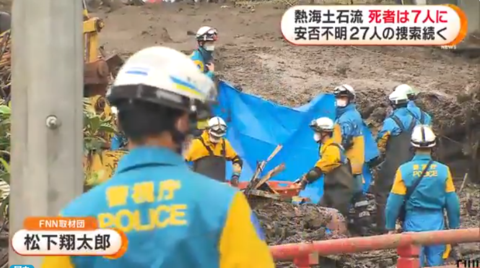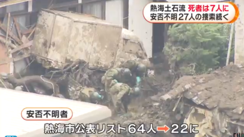 截至6日,泥石流灾害已致7死。救援黄金72小时已过,灾民生存率会急剧下降,但日方搜救工作仍在紧张持续。根据静冈县及热海市政府统计,当地122栋民宅中的215人受到泥石流灾害影响,其中22人去向不明。据警方统计,灾情发生后,另有5人失联。县政府已公布这27名失踪者的姓名、性别等信息,呼吁民众提供线索。