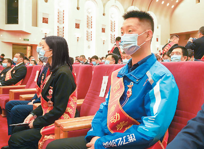 饿了么外卖小哥宋增光(前右)获得“全国五一劳动奖章”。王 鑫摄(新华社发)