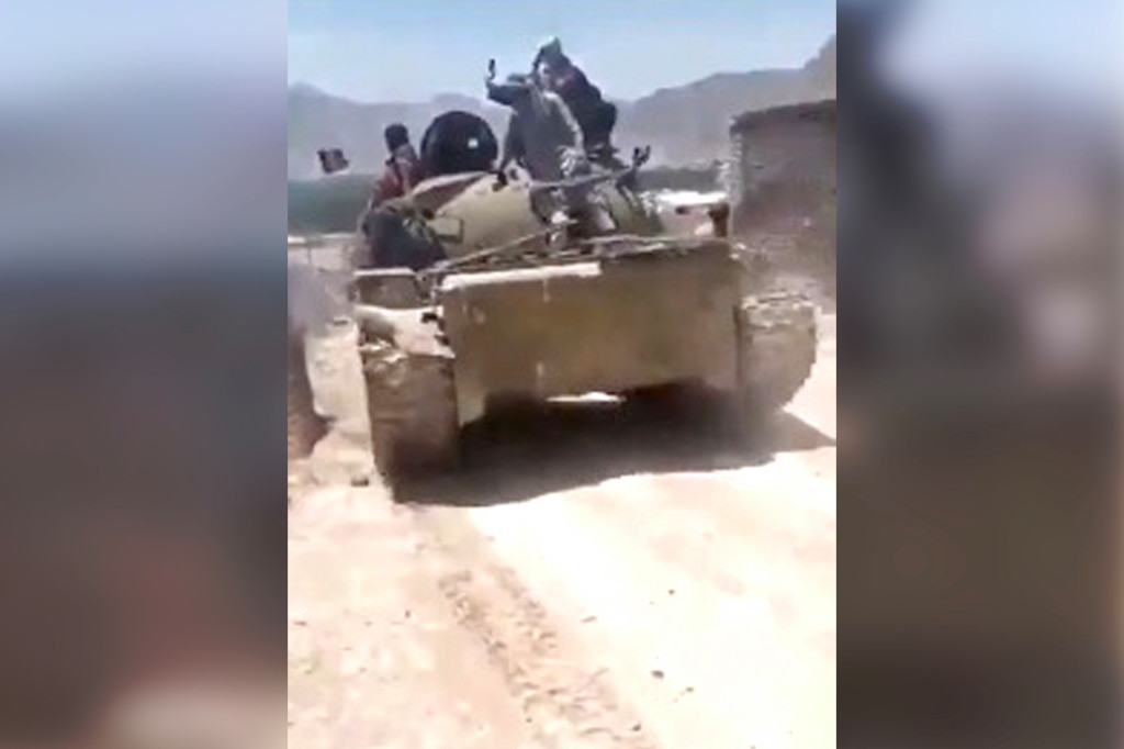 塔利班高调展示缴获的武器。(视频截图)
