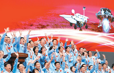 航天科研人员在北京航天飞行控制中心指挥大厅庆祝我国首次火星探测任务着陆火星成功。新华社发