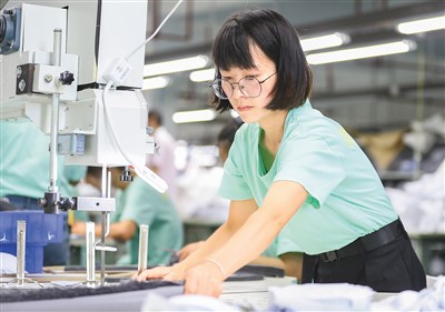 当前,贵州省铜仁市玉屏侗族自治县出口服装生产企业正迎来生产和销售旺季,该县产品销往欧美等30多个国家和地区。图为企业员工在赶制订单。胡攀学摄(人民视觉)