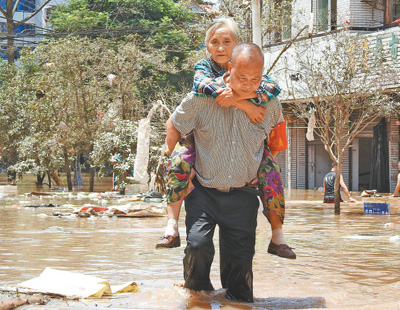 12日,四川达州,基层干部在洪水中转移老人。邓良奎摄(人民视觉)
