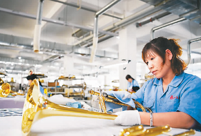天津市津宝乐器有限公司可生产打击乐器和管乐器成品及零件在内的400余种产品,产品出口全球数十个国家和地区。图为员工在该公司车间组装小号。新华社记者 李 然摄