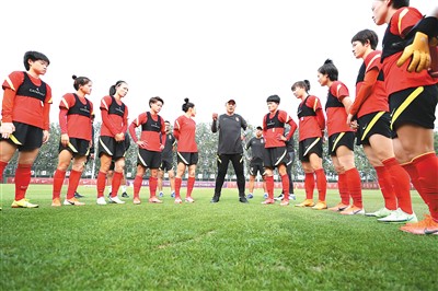 中国女足主教练贾秀全(中)在训练课前指导队员。新华社记者 丁 旭摄