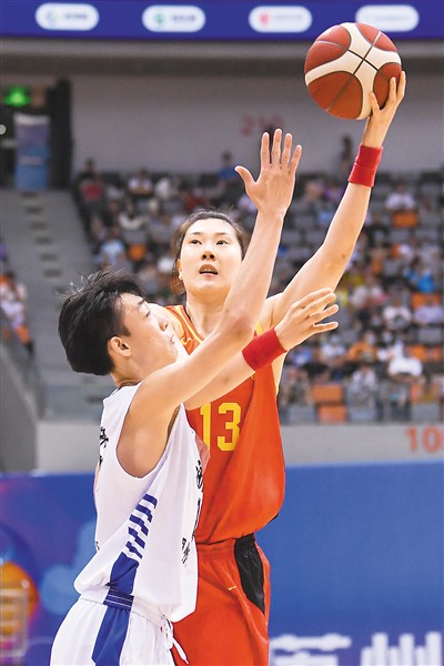 中国女篮球员孙梦然(右)在热身赛中。新华社记者 李 博摄