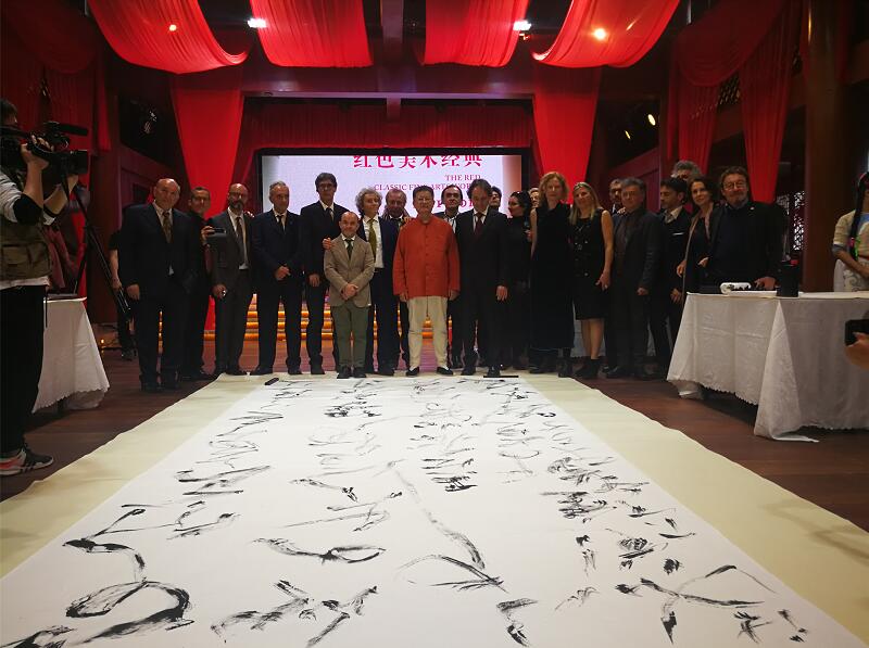 水墨夜宴上,中国国家画院副院长曾来德挥毫巨幅书法作品,与意大利艺术家合影(章欣摄影)