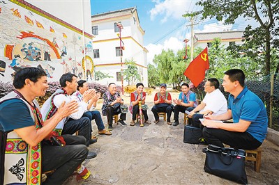 7月7日,云南省曲靖市陆良县纪委监委干部在龙海乡小新村向彝族干部宣讲习近平总书记在庆祝中国共产党成立100周年大会上重要讲话精神。王 勇摄(人民图片)