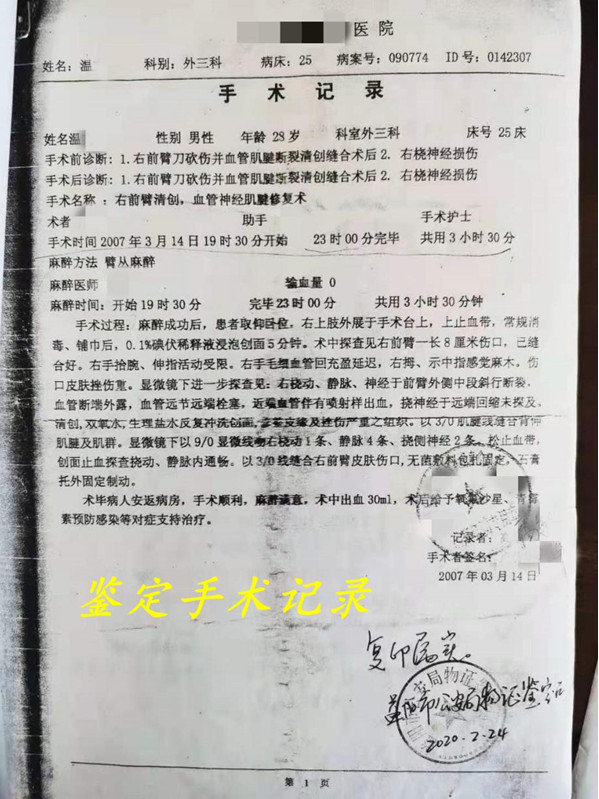 其次,益阳市中心医院的病历资料没有关于被害人温某有右桡动脉、静脉断裂伤情的记载,且益阳市中心医院已就被害人温某的伤情进行了清创缝合、伸肌缝合并确认被害人温某病情较稳定。鉴定结论依据的手术记录显示,被害人温某在经益阳市中心医院治疗后,在A医院的手术中发现有“右桡动、静脉、神经于前臂外侧中断斜形断裂”的伤情,该伤情与益阳市中心医院的记录明显不相符,鉴于手术记录的来源不明,鉴定手术记录的真实性存疑。