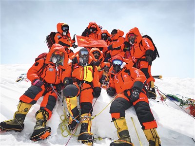 2020年5月27日,2020珠峰高程测量登山队在峰顶合影留念。 扎西次仁摄