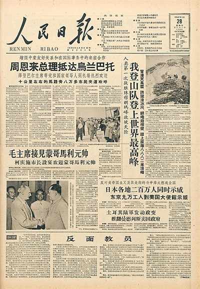 1960年5月25日,中国登山队员王富洲、贡布、屈银华首次从北坡登顶珠穆朗玛峰,中国人的足迹终于踏上了地球之巅。同年5月28日,人民日报向全世界宣告了这一历史性时刻——《我登山队登上世界最高峰》。喜讯随着报纸传遍了大江南北,人们纷纷举行庆祝活动,甚至给登山队员写信,表达激动的心情。