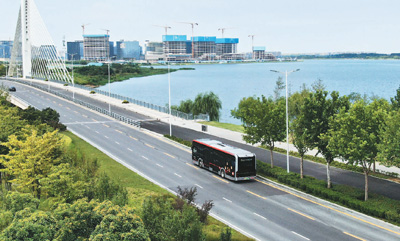 河南省郑州市郑东新区自动驾驶公交1号线车辆行驶在试运行的道路上。 新华社记者 李 安摄