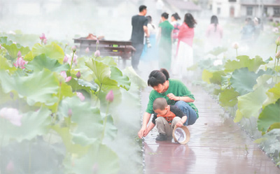 近日,安徽省宣城市旌德县俞村镇的百亩荷花竞相开放,吸引了众多游客前来游玩,带动村民增收。 江建兴摄(人民视觉)
